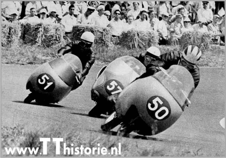 Links onder zie je dat er behoorlijk veel bussen stonden geparkeerd en die waren natuurlijk allemaal volgeladen geweest met liefhebbers die de Asser TT races wilden gaan zien. Op de tweede foto van links zie je de start van de eerste race die op het nieuwe circuit werd gehouden, namelijk de 250cc klasse. Op de derde foto zie je Luigi Taveri, de latere winnaar van die 250cc race. (Eigenlijk werd die 250cc race gewonnen door Bill Lomas, maar Lomas had tijdens het bijtanken zijn motor laten draaien (hetgeen niet was toegestaan) en werd daarom als tweede geklasseerd. Er werd echter beroep aangetekend, waardoor Lomas aanvankelijk door de KNMV toch tot winnaar werd verklaard. NSU rijder Hermann Paul Müller, die in eerste instantie als vierde over de finish kwam, ging hiertegen in beroep bij de FIM, die Lomas ten slotte helemaal uit de uitslag schrapte. De overwinning ging nu naar zijn MV Agusta teamgenoot Luigi Taveri en Müller kwam nu als derde prijs winnaar in de boeken) Op de vierde foto zie je de bijna start van de 125cc race, met op 1 Carlo Ubbiali, op 2 Luigi Taveri, op 3 Remo Venturi en op 10 Willi Scheidhauer. Op de vijfde foto zie je Remo Venturi op z’n MV Agusta en hij zou tweede worden in de 125cc race, met slechts een fractie van een seconde achterstand op Ubbiali! De man in het witte hempje en met petje op die vijfde foto is trouwens Umberto Masetti, Umberto kwam later die dag als derde over de eindstreep in de 500cc race. Op de rechter foto zie je links Remo Venturi en rechts de winnaar van die 125cc race, namelijk Carlo Ubbiali.